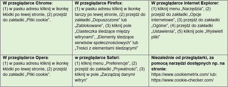 7.5. Standardowo większość przeglądarek internetowych dostępnych na rynku domyślnie akceptuje zapisywanie plików Cookies. Każdy ma możliwość określenia warunków korzystania z plików Cookies za pomocą ustawień własnej przeglądarki internetowej. Oznacza to, że można np. częściowo ograniczyć (np. czasowo) lub całkowicie wyłączyć możliwość zapisywania plików Cookies – w tym ostatnim wypadku jednak może to mieć wpływ na niektóre funkcjonalności Sklepu Internetowego (przykładowo niemożliwym może okazać się przejście ścieżki Zamówienia poprzez Formularz Zamówienia z uwagi na niezapamiętywanie Produktów w koszyku podczas kolejnych kroków składania Zamówienia).