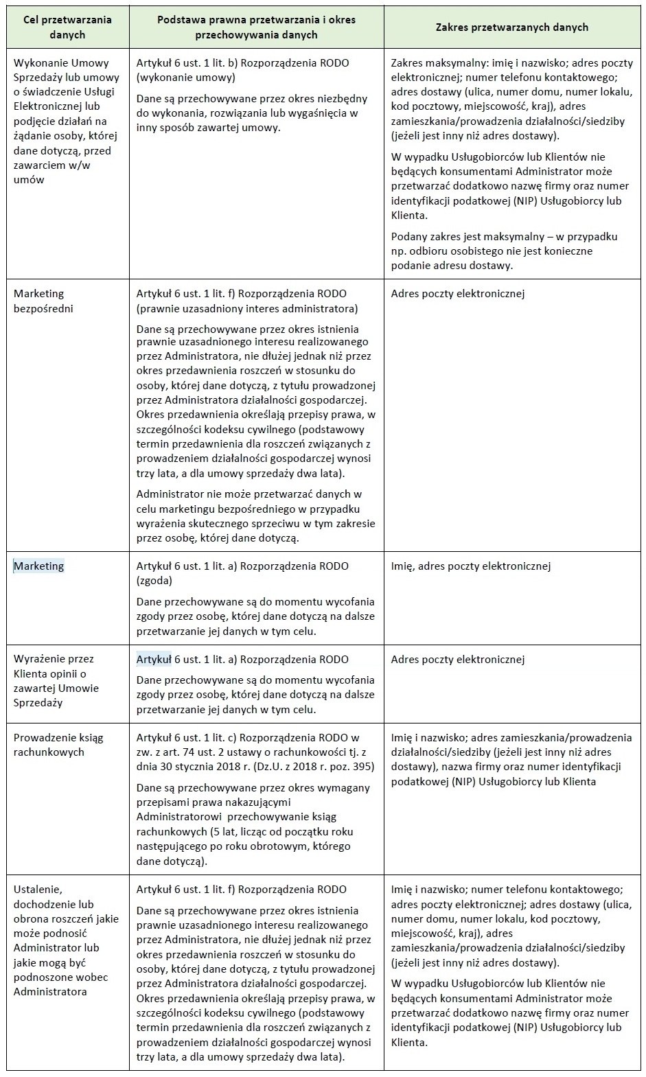 3.1. Każdorazowo cel, podstawa, okres i zakres oraz odbiorcy danych osobowych przetwarzanych przez Administratora wynika z działań podejmowanych przez danego Usługobiorcę lub Klienta w Sklepie Internetowym. Przykładowo jeżeli Klient decyduje się na dokonanie zakupów w Sklepie Internetowym i wybierze odbiór osobisty zakupionego Produktu zamiast przesyłki kurierskiej, to jego dane osobowe będą przetwarzane w celu wykonania zawartej Umowy Sprzedaży, ale nie będą już udostępniane przewoźnikowi realizującemu przesyłki na zlecenie Administratora.
