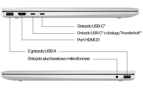 - porty i złącza: 1 port Thunderbolt 4, transfer do 40 Gb/s (zgodny z USB Type-C, funkcja DisplayPort 2.1, służy również jako złącze ładowania) | 1 port USB Type-C (10 Gb/s, funkcja DisplayPort 1.4) | 2 port USB Type-A (10 Gb/s) | wejście mikrofonowe / wyjście słuchawkowe stereo (combo) | cyfrowe złącze HDMI 2.1
