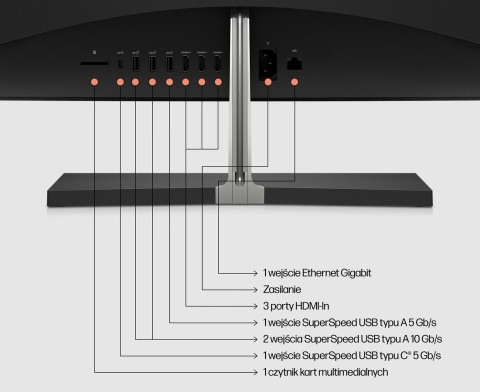 - porty i złącza: 1 port USB Type-C, 5 Gb/s (tył) | 2 porty USB Type-A, 10 Gb/s (tył) | 1 port USB Type-A, 5 Gb/s (tył) | 3 wejściowe porty HDMI (tył) | złącze RJ-45 (tył)